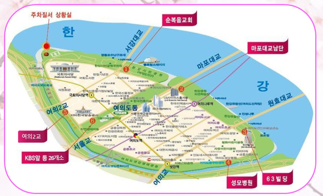 2024 여의도 벚꽃축제 현황은 위의 좌표를 확인하시면 되겠습니다.