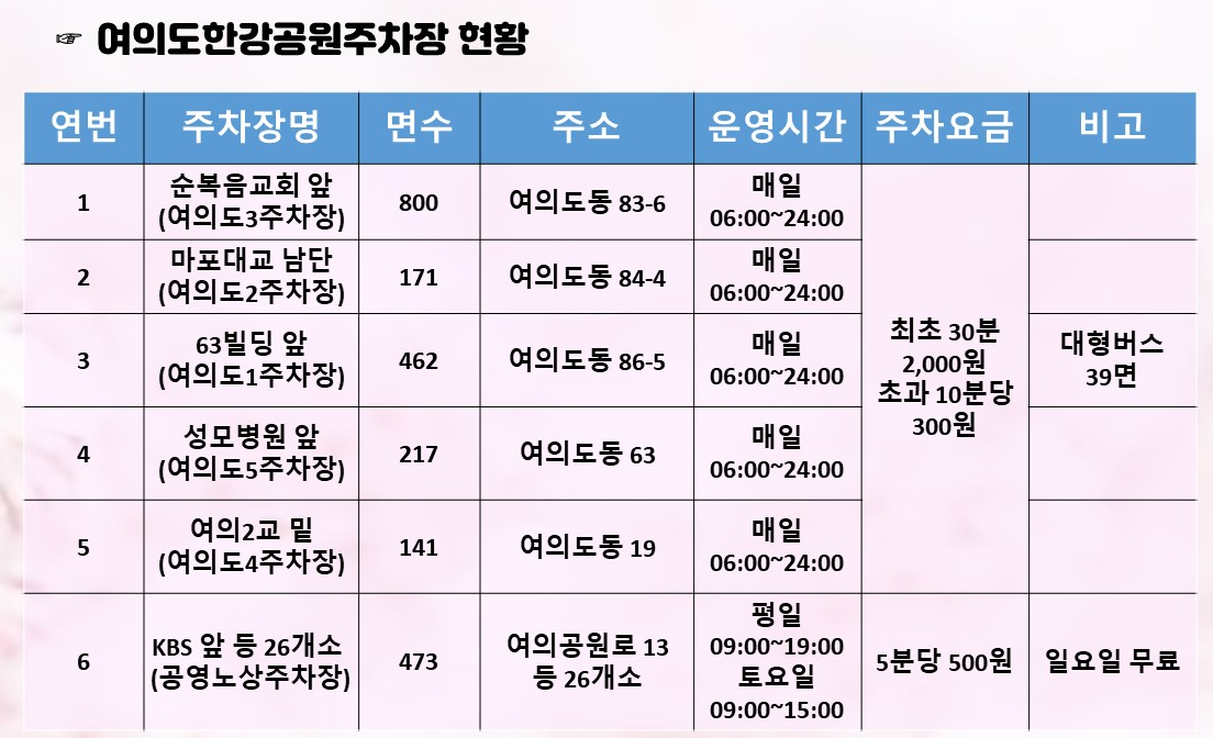 위의 여의공원로 13 주차장은 일요일이 무료라고 합니다.