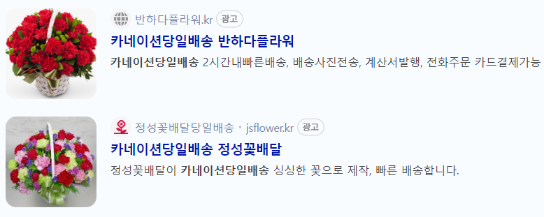 5월 어버이날 직접 카네이션을 구매할 시간이 없다면, 위의 '반하다 플라워' 또는 '정성꽃배달 당일배송' 서비스를 이용하시면 되겠는데요.