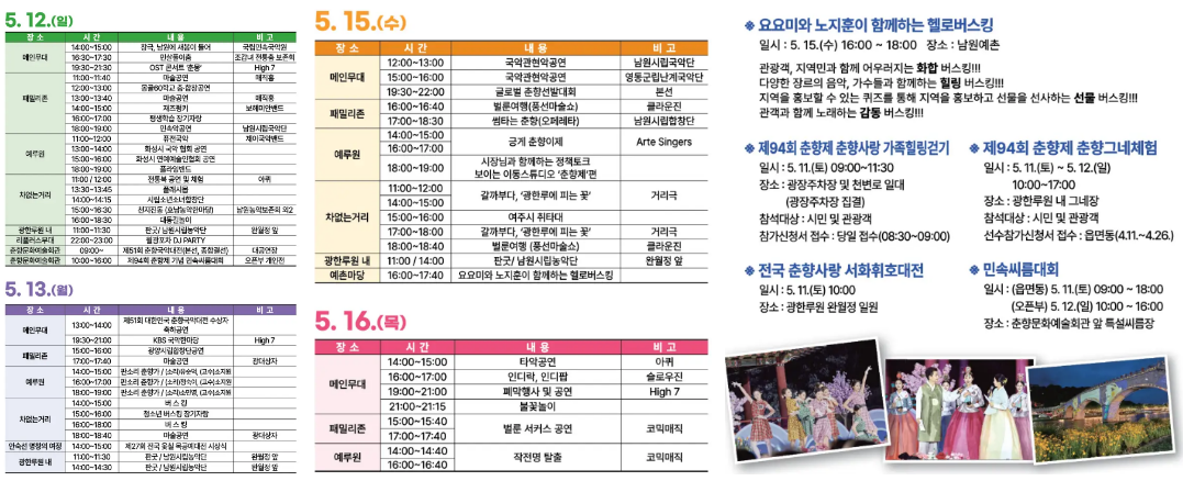 춘향제 행사일정은 5월 10일에 진행되며, 석가탄신일이 15일에 겹치게 되면서 많은 인파가 몰릴 것으로 예상됩니다. 그전에 위의 행사일정표를 미리 파악하시고 일찍 가셔서 공연에 좋은 자리를 선점하시면 좋겠습니다.