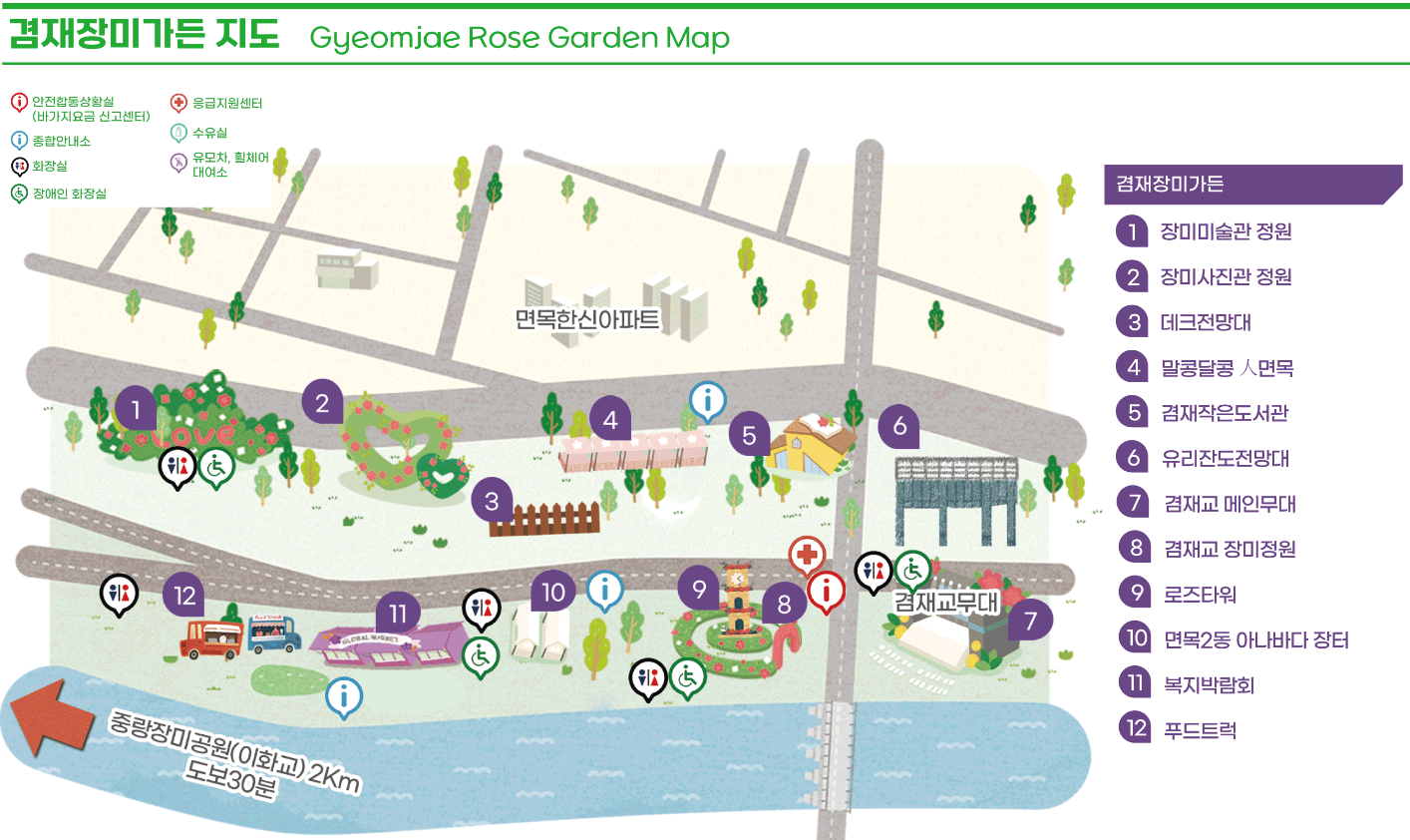 우리가 체험해보고 싶은 장미축제의 프로그램의 위치가 정확히 어딘지 궁금하다면, 아래 중랑 장미축제 지도를 보면 확인할 수 있겠는데요. 휴게소 및 화장실 위치까지 확실하게 알 수 있으니 방문 전에 미리 확인하시길 바랍니다.