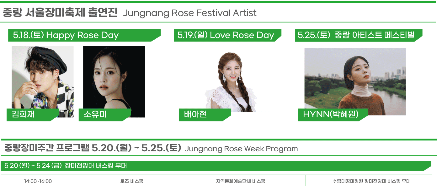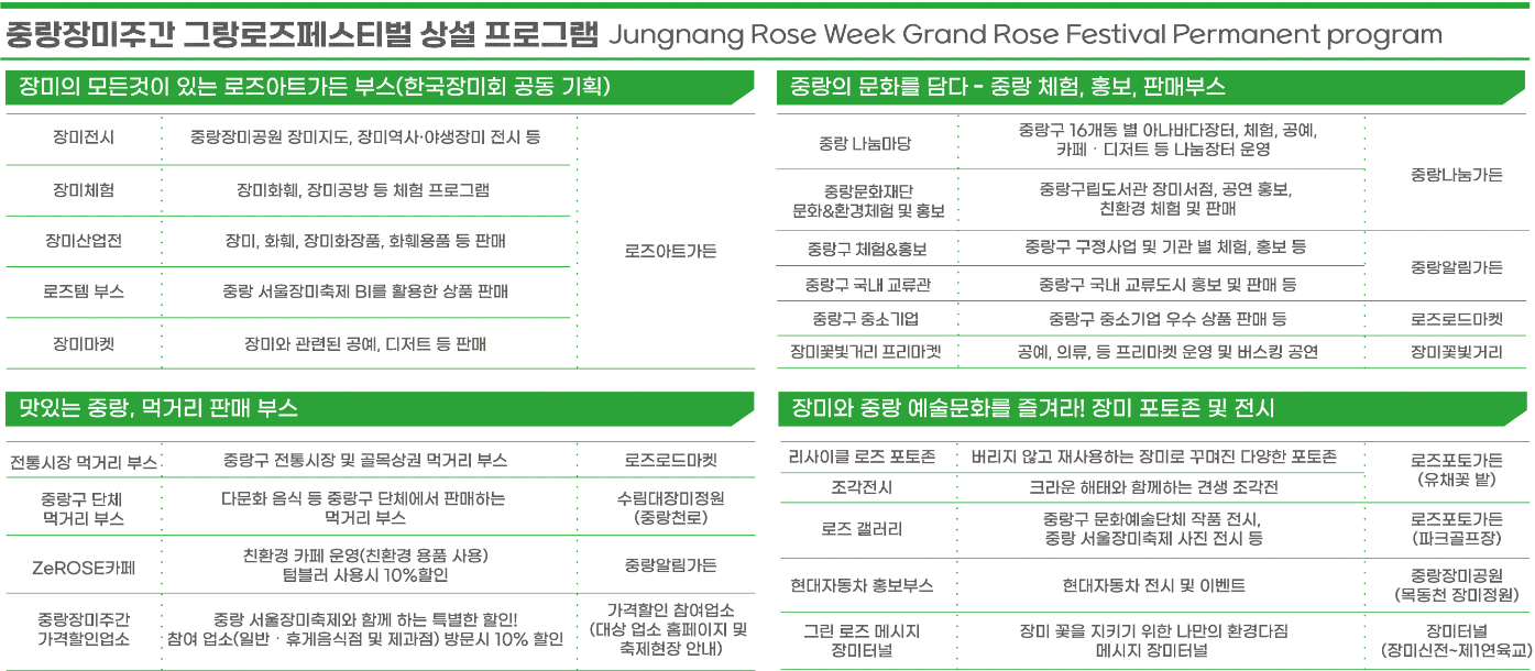 2024 중랑 장미축제 일정표는 다음과 같습니다. 인기 가수들의 초청 공연 및 다양한 체험 프로그램 정보들도 있으니 아래 내용 참고하셔서 아름다운 장미축제에서 우리 가족 연인 친구들과 좋은 추억 쌓으시길 바랍니다.