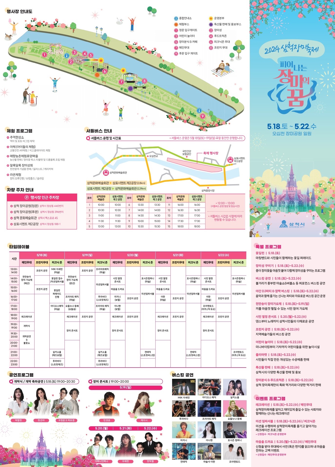 위의 주차장 정보 미리 파악하셔서 빠르게 주차하시고, 삼척 장미축제를 즐기시면 좋겠는데요. 이제 주차정보까지 다 아셨다면, 축제의 별미!라고 할 수 있는 장미축제 행사일정을 알면 더 알차게 축제를 즐길 수 있을 텐데요!