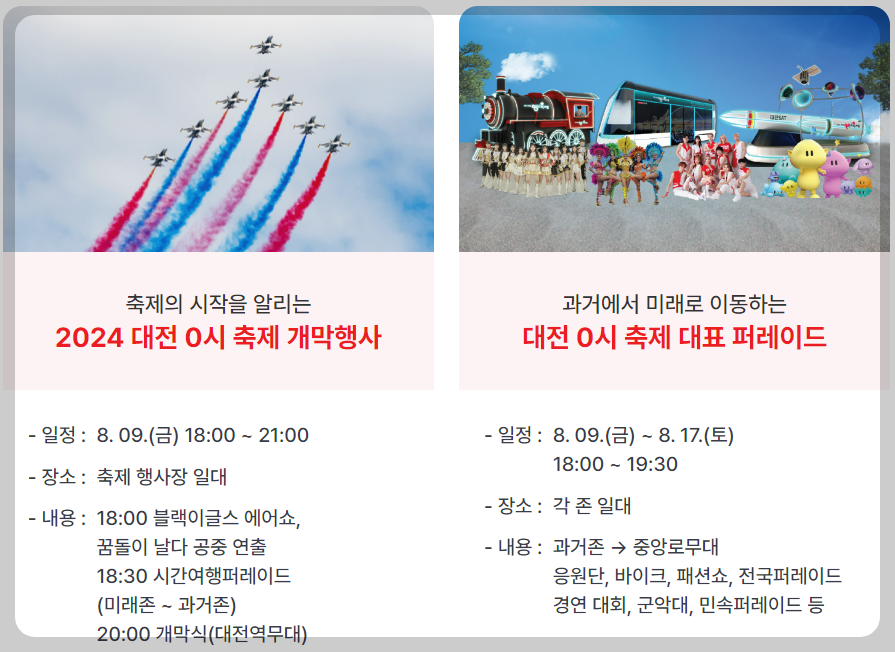 대전 0시축제는 대전의 과거, 현재, 미래를 주제로 한 시간 여행 축제로, 다양한 프로그램과 이벤트가 준비되어 있습니다. 주요 일정은 다음과 같습니다.