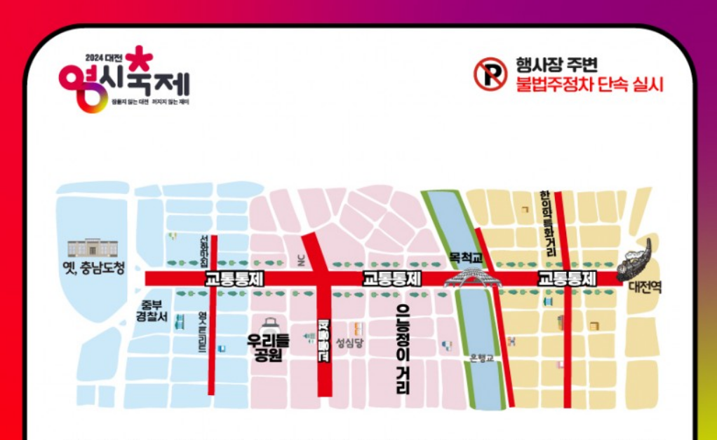 축제 기간 동안 대전역에서 옛 충남도청까지의 구간은 차량 통제가 이루어집니다. 자세한 내용은 다음과 같습니다: