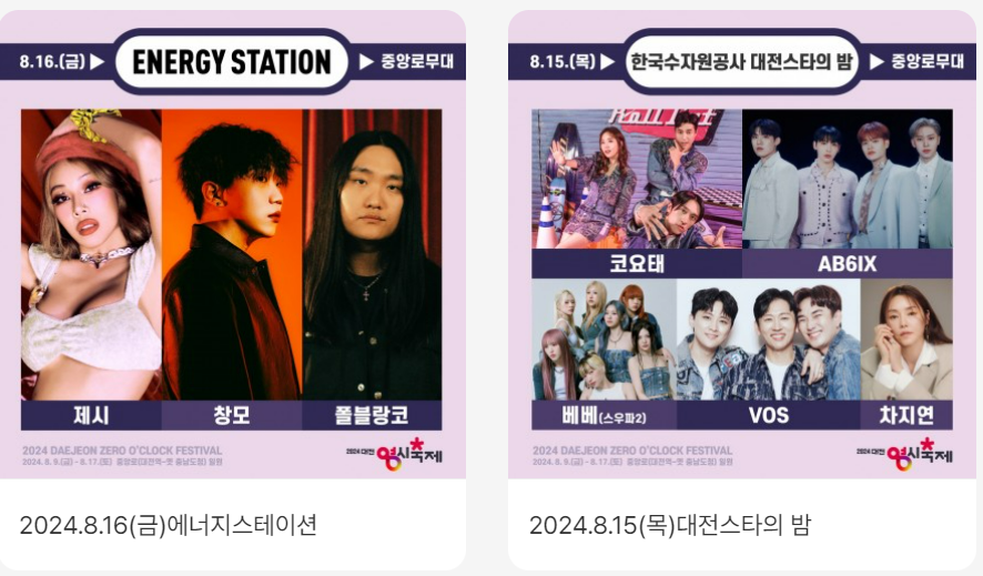 - 8월 15일(목): 한국수자원공사 대전 스타의밤 (홍명원, 서경석, 백봉기, VOS, 김의영, 스우파2 베베, 차지연, AB6IX, 코요태)