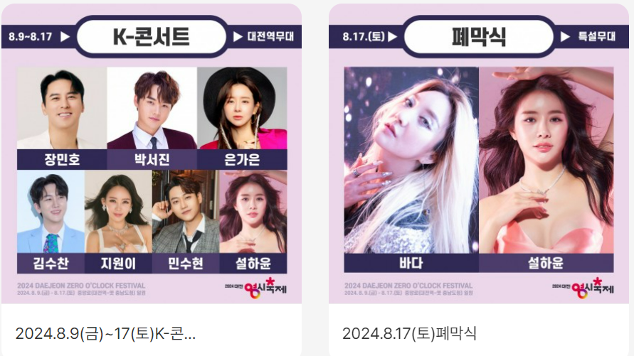 인기있는 가수들의 공연 시간표에 대해서 정리해보았는데요. 대전 0시축제 공식홈페이지(👈여기)에 접속하시면, 대전에서만 즐길 수 있는 환상적인 길거리 퍼레이드 일정과 먹거리 존에대한 위치까지 확실히 알 수 있으니 미리 확인하세요!