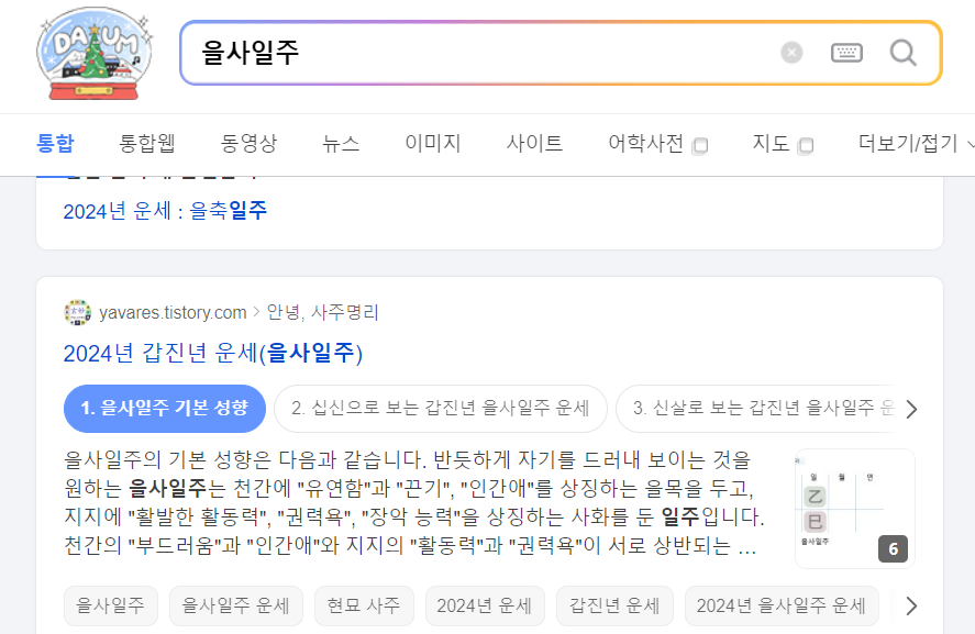 💡그리고 이번 2024년 갑진년에 나에게 큰 대운이 들어올지 궁금하다면 (ex. 갑진년 xx일주) 이런식으로 검색을 해보면 나만의 자세한 맞춤형 신년 운세에 대해서 자세하게 나옵니다.