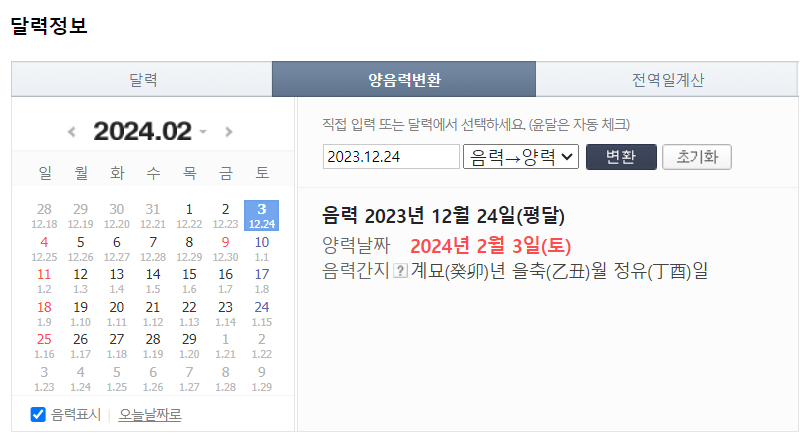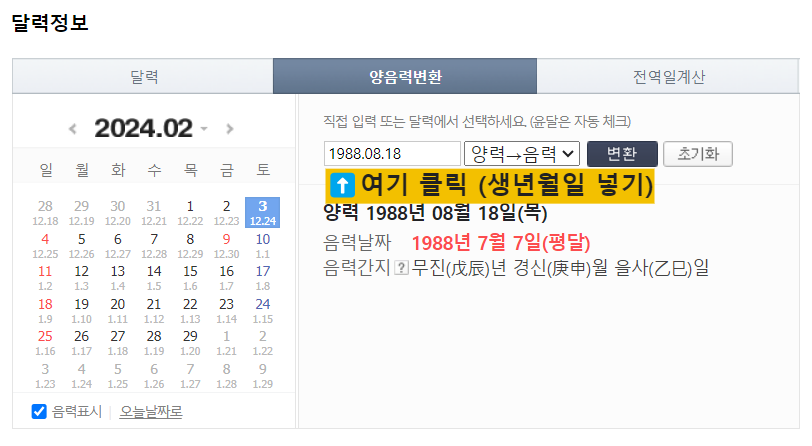 일단 신년운세를 알아보기에 앞서 나의 양력 생일을 음력으로 변환을 해야 하는데요.