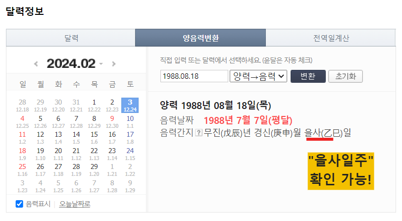 사주팔자, 생일을 음력으로 변환하면 나의 일주를 알 수 있다.