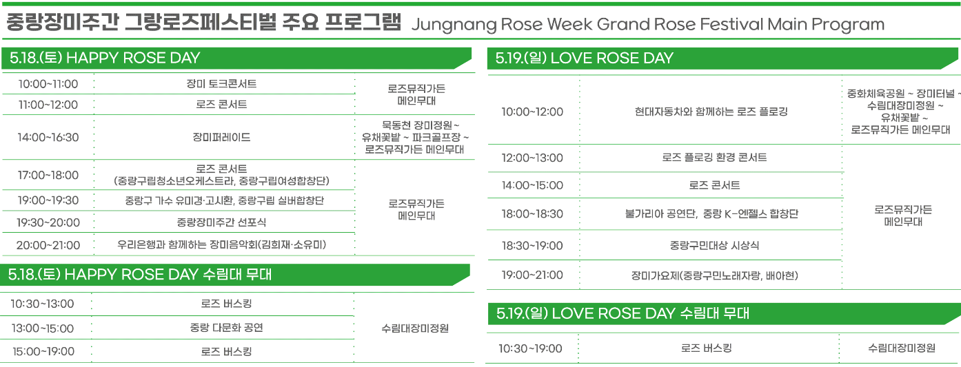 2024 중랑 장미축제 일정표는 다음과 같습니다. 인기 가수들의 초청 공연 및 다양한 체험 프로그램 정보들도 있으니 아래 내용 참고하셔서 아름다운 장미축제에서 우리 가족 연인 친구들과 좋은 추억 쌓으시길 바랍니다.