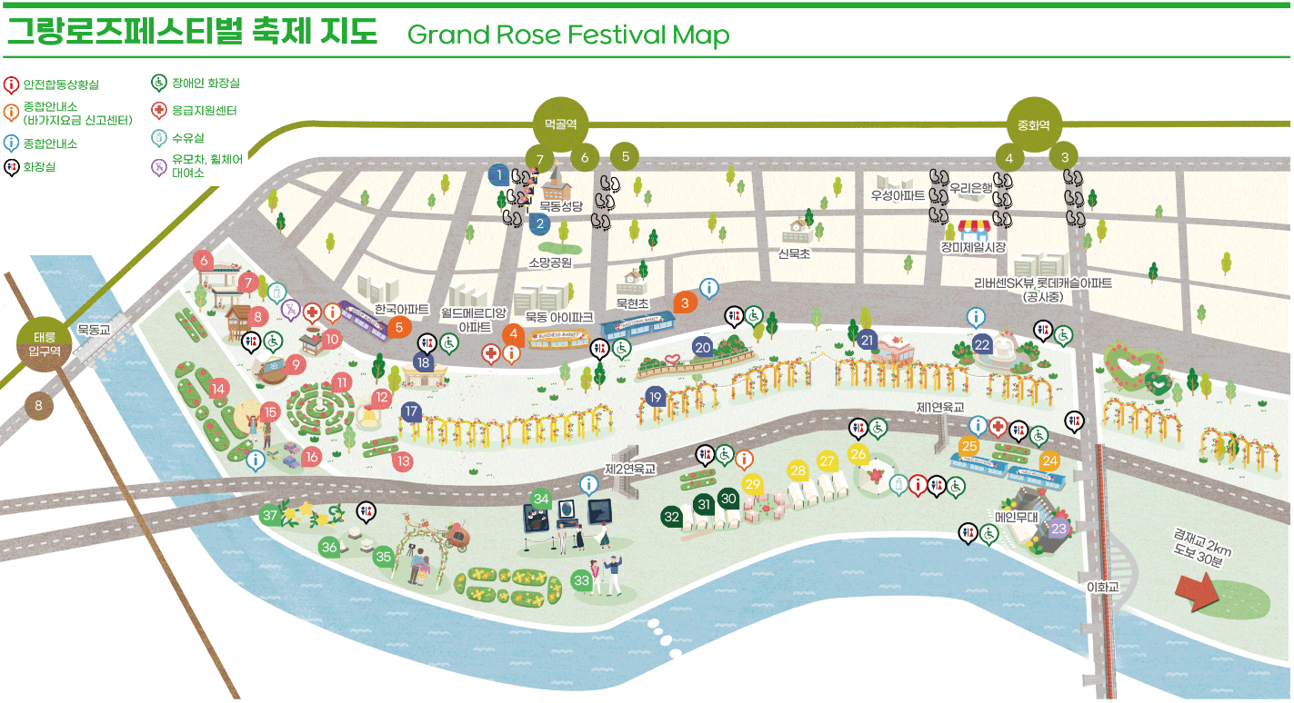 그랑로즈 페스티벌 축제지도에서 종합 안내소, 화장실, 유모차, 휠체어 대여소, 수유실까지 바로 확인할 수 있으니 참고하시면 좋겠습니다.