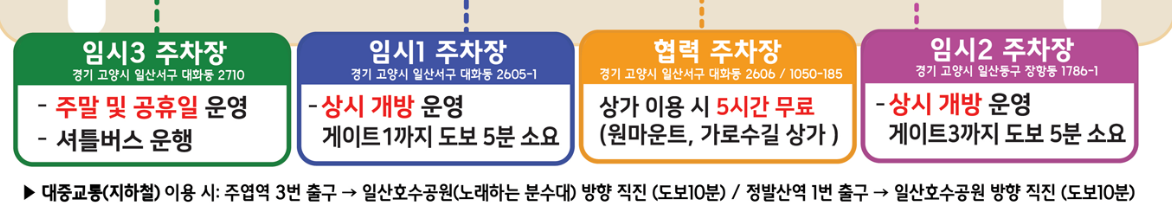 - 임시 1주차장: 상시 개방 운영 (경기 고양시 일산서구 대화동 2605-1)