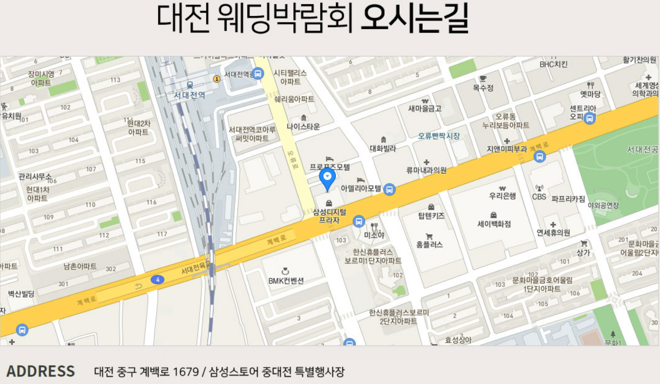 많은 예비부부님들이 찾는 대전웨딩박람회의 정확한 네비 좌표 주소는 대전 중구 계백로 1679입니다.